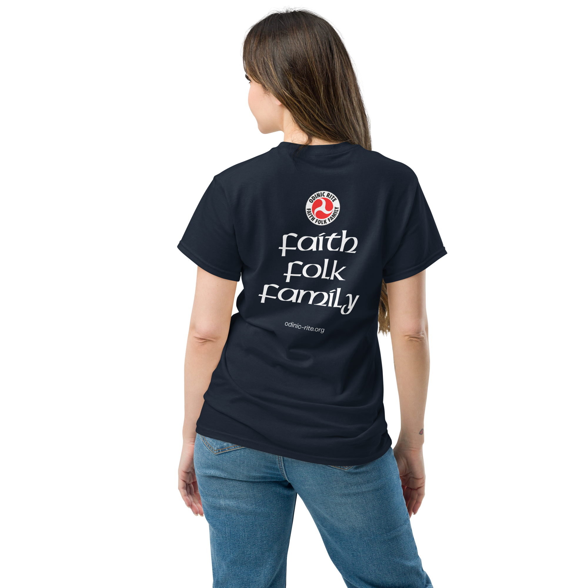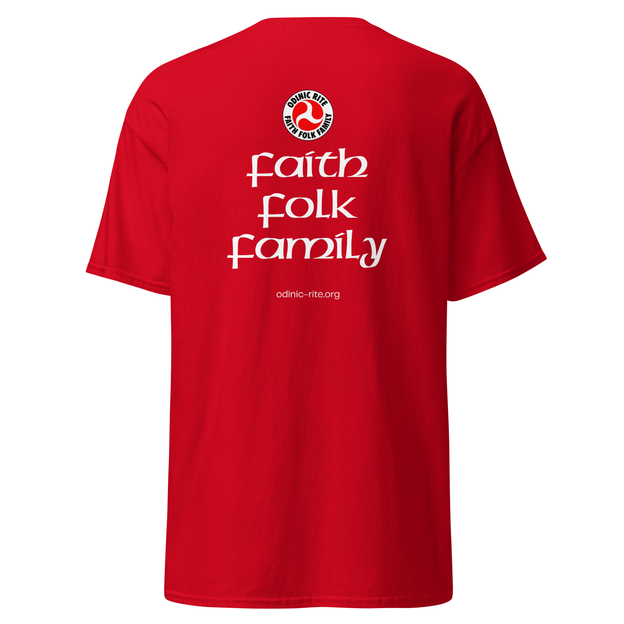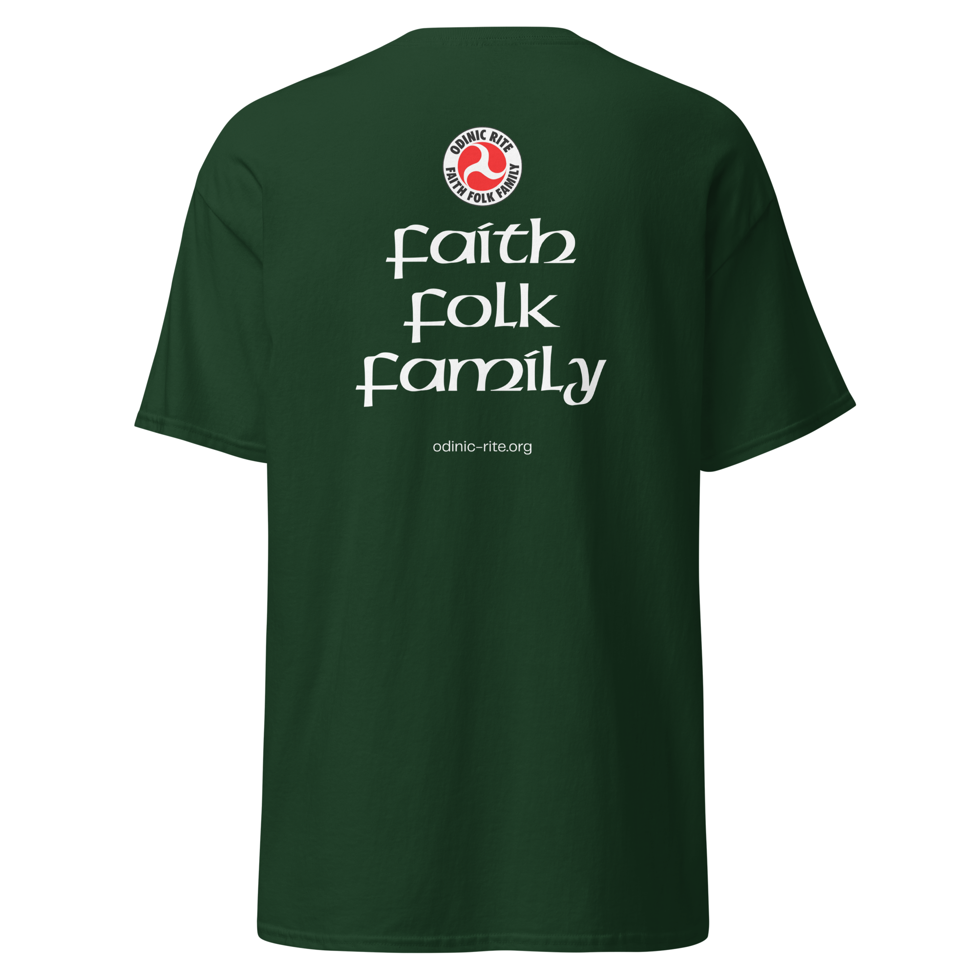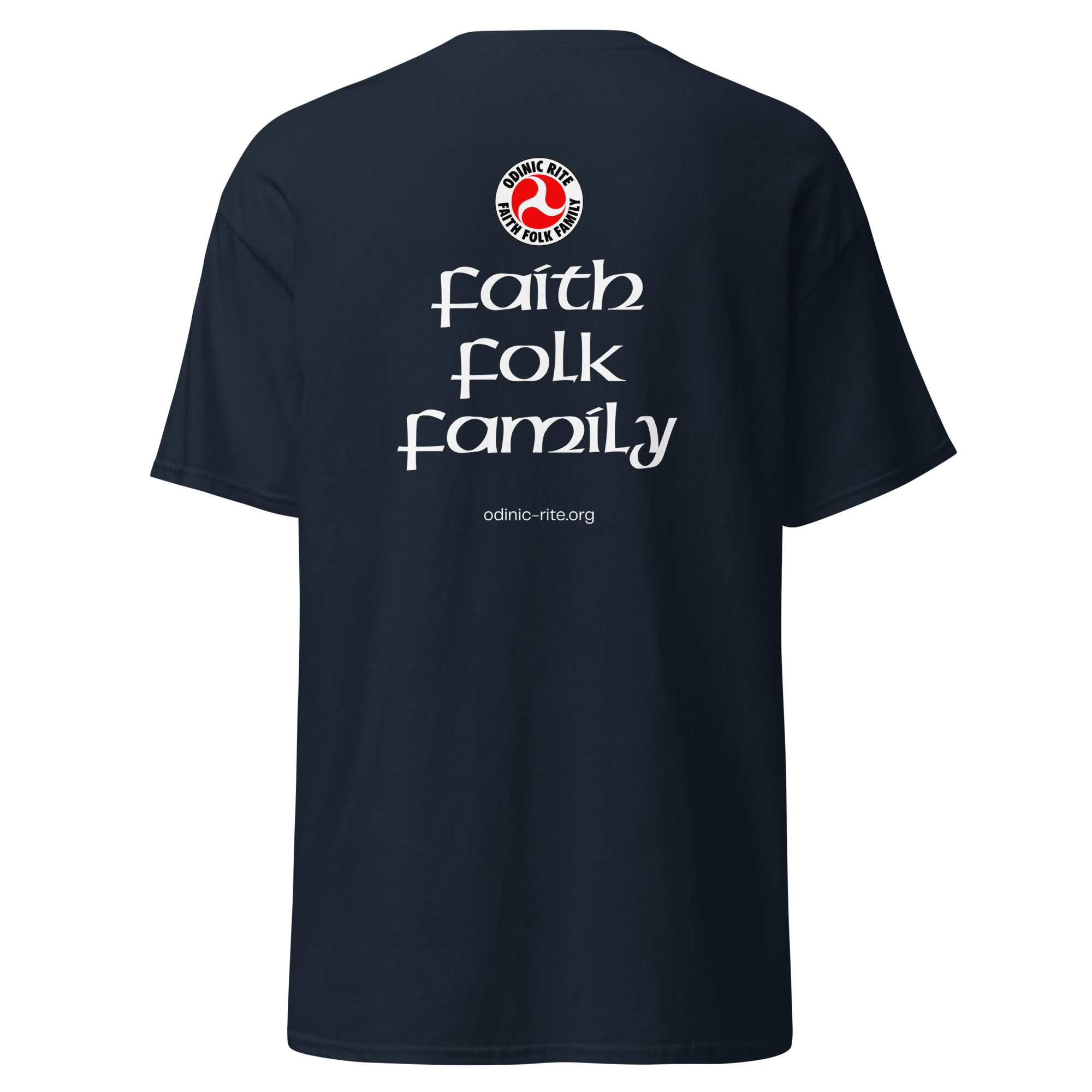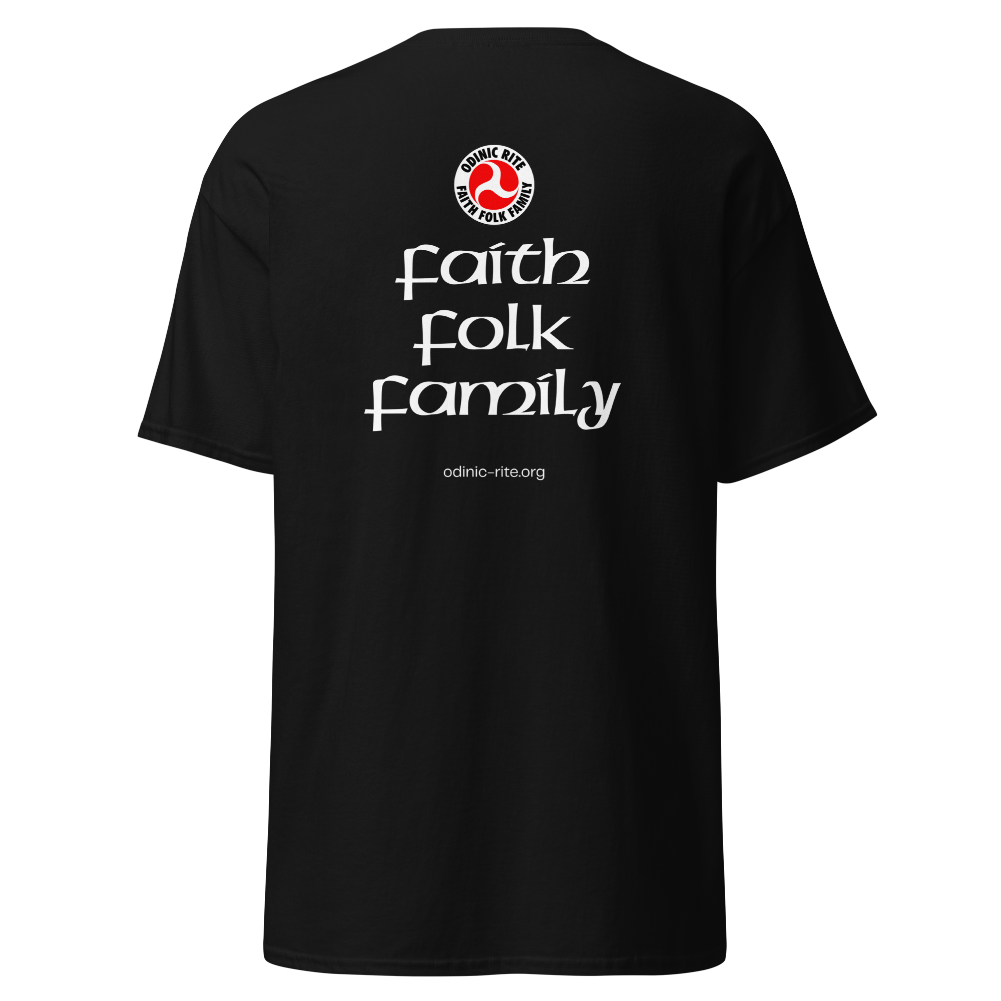 The rear of the shirts features the OR logo, the words “Faith, Folk, Family” and the Odinic Rite web address.