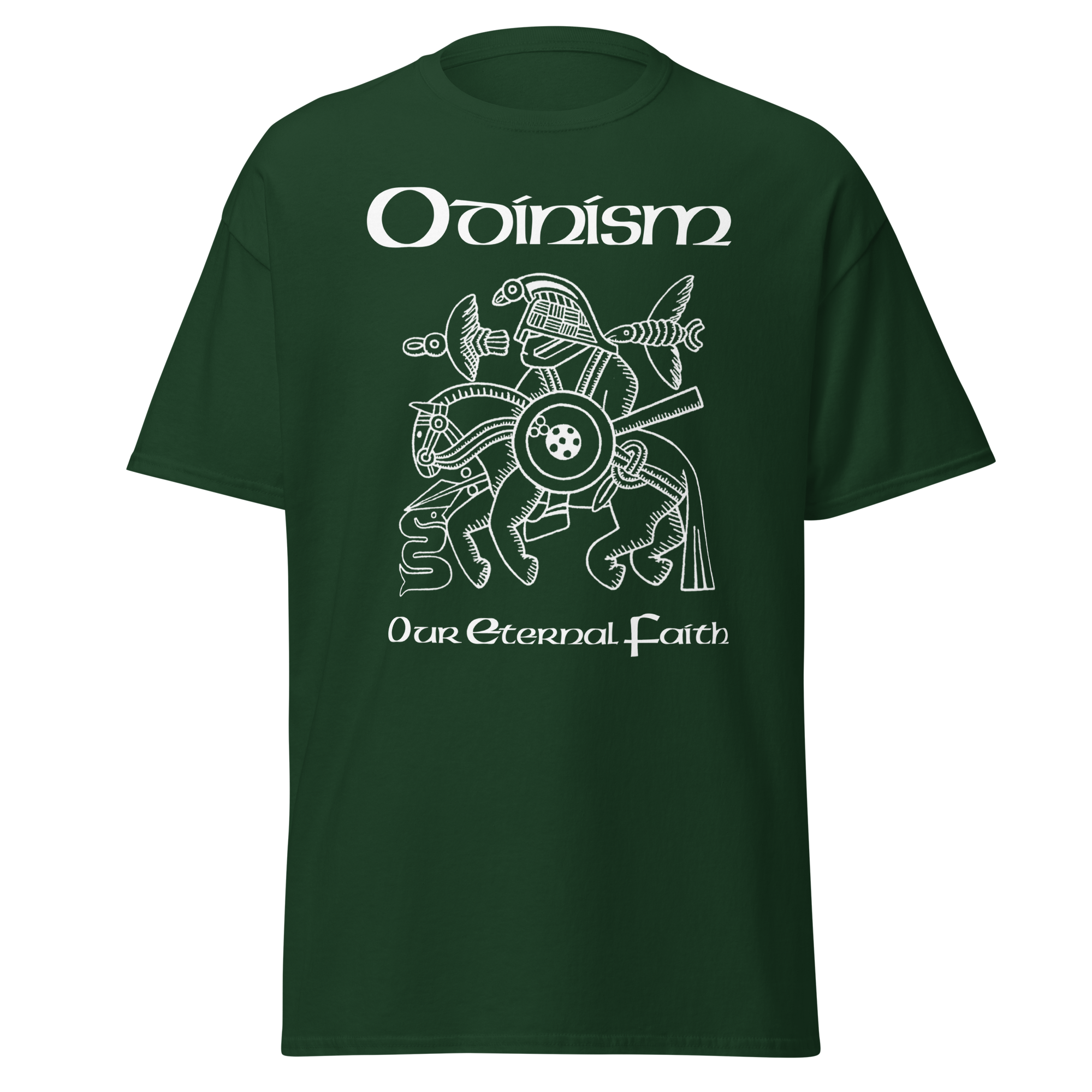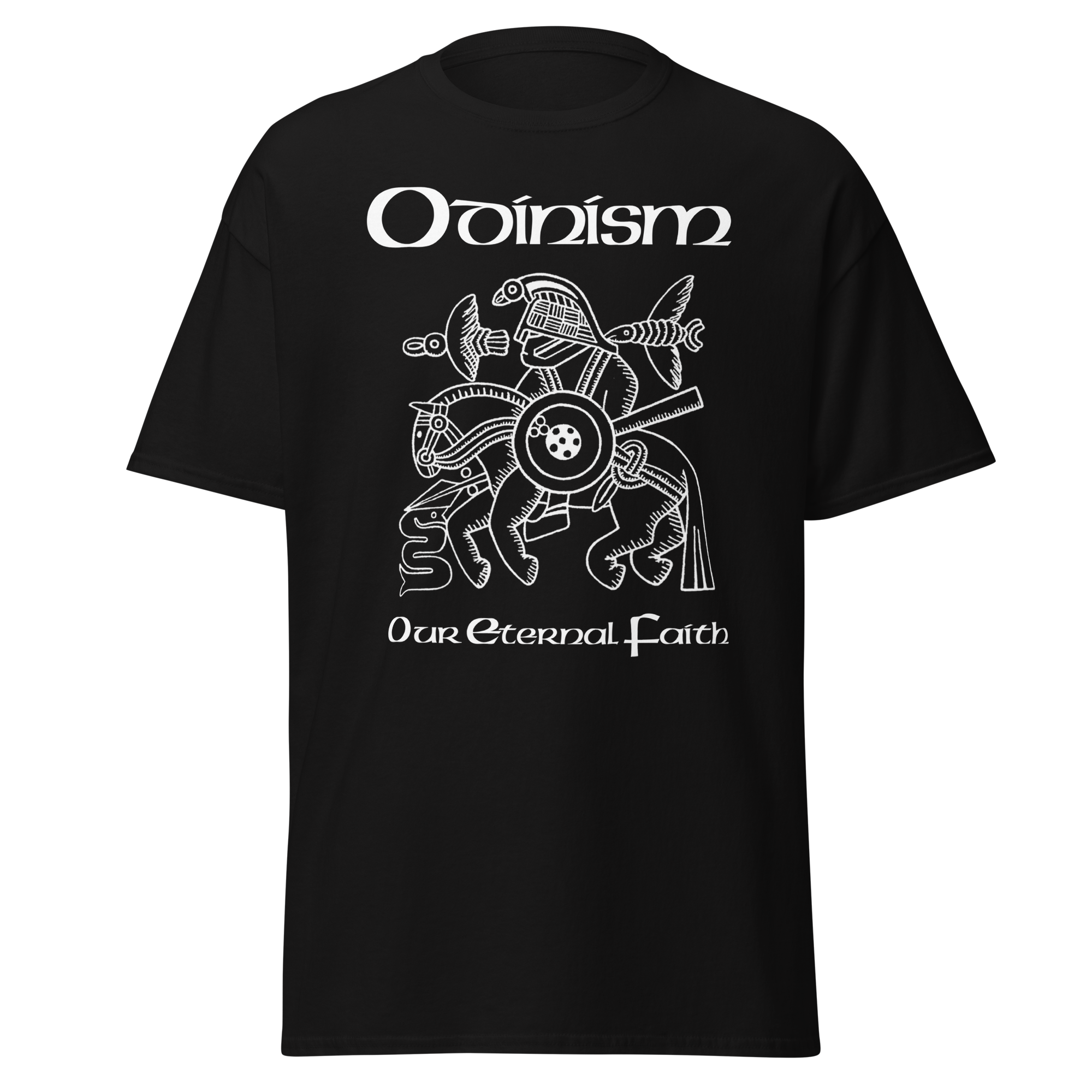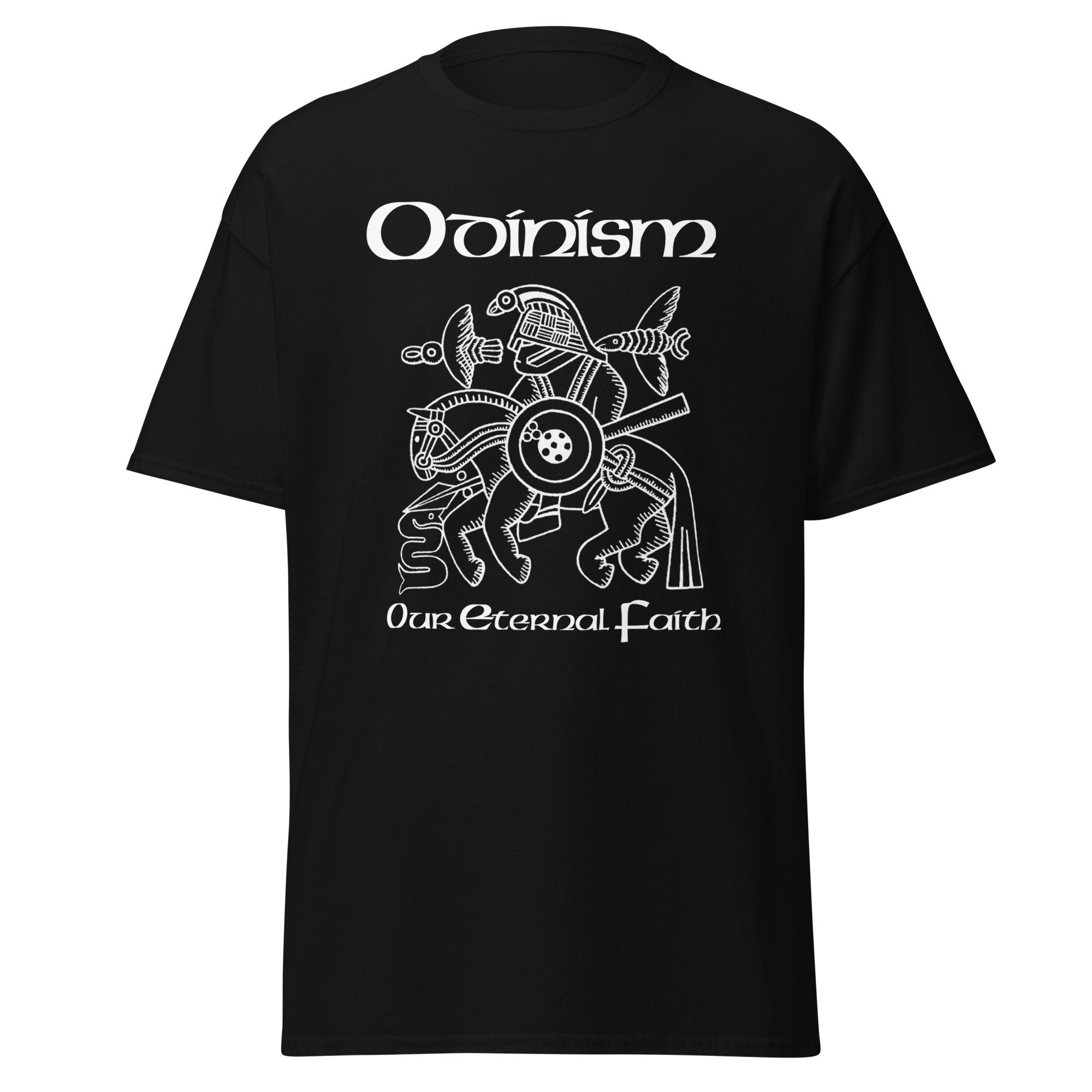 On the front is the famous image, interpreted as Odin on Sleipnir from the Vendel helmet, with the words Odinism – Our Eternal Faith.