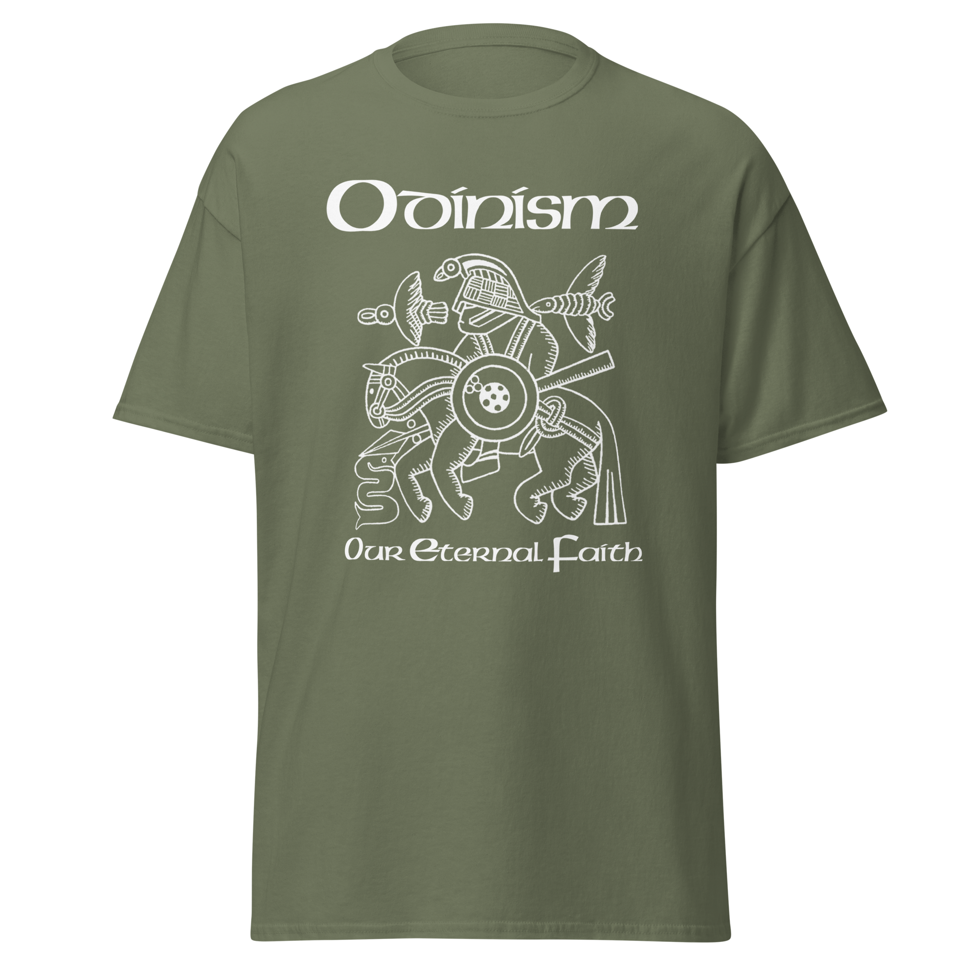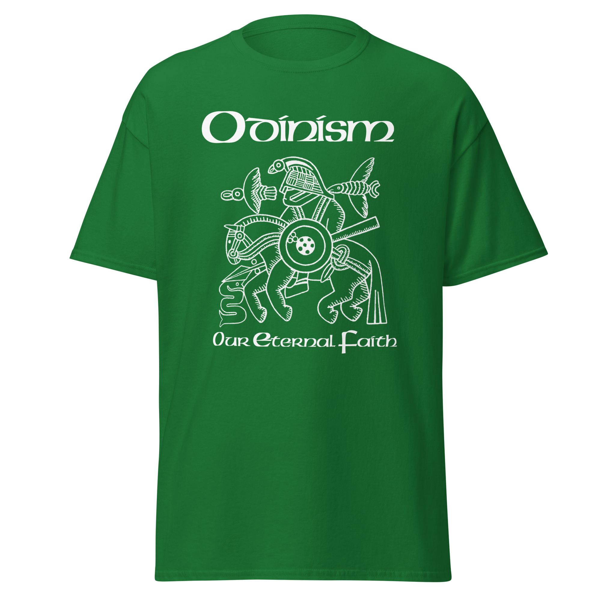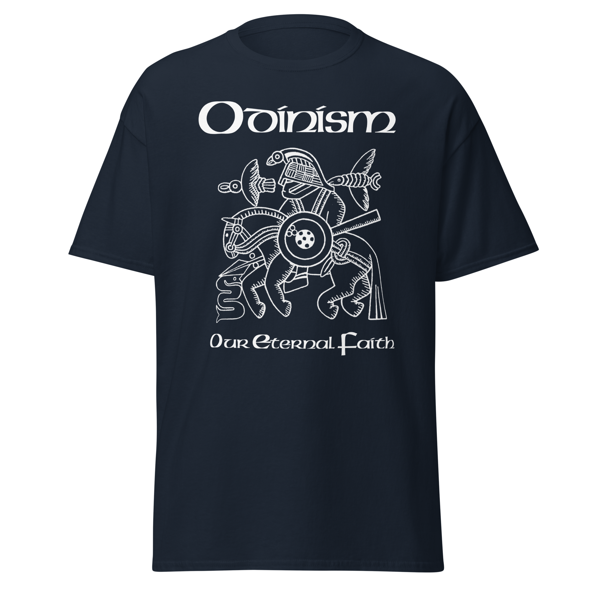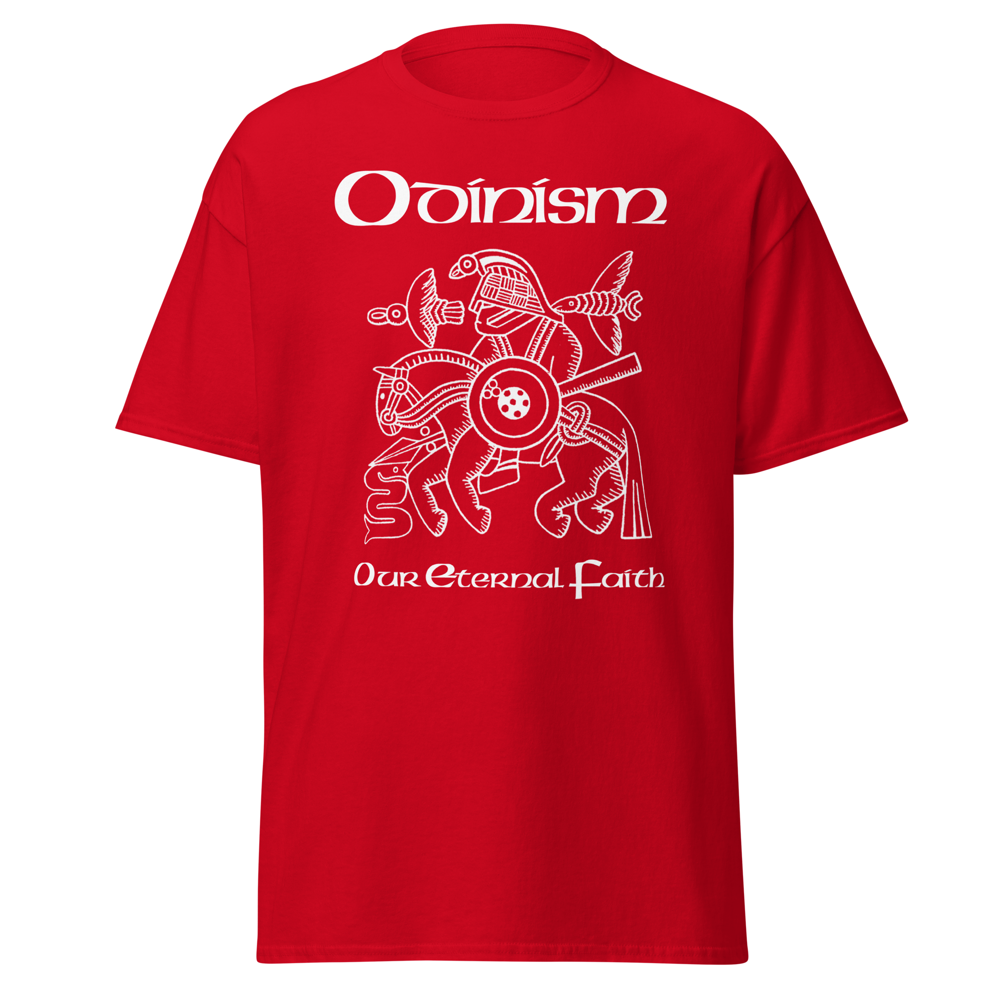 On the front is the famous image, interpreted as Odin on Sleipnir from the Vendel helmet, with the words Odinism – Our Eternal Faith.